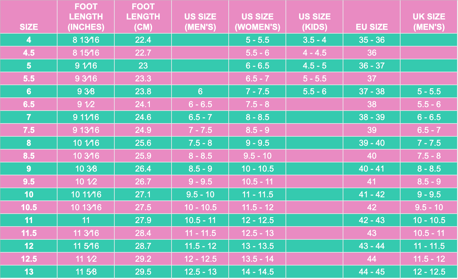 Available colors and sizes:
