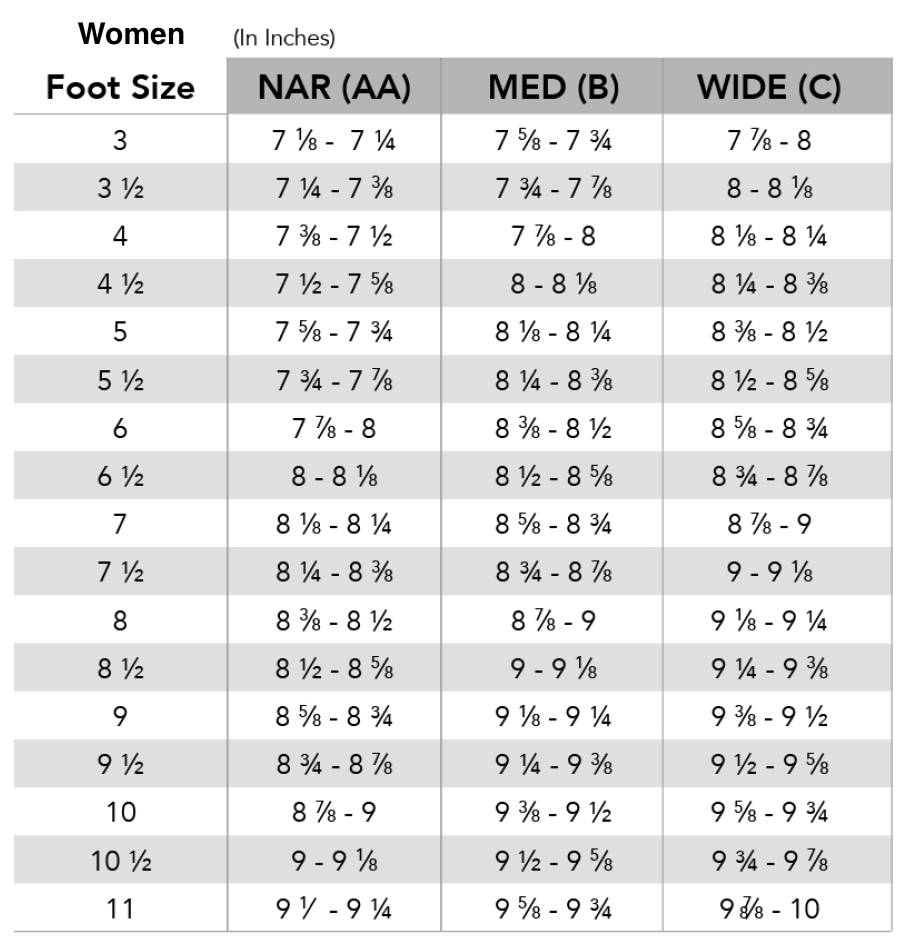 - White: Ladies 4–10 Full and Half sizes, 11 Full size only; Medium and Wide Widths