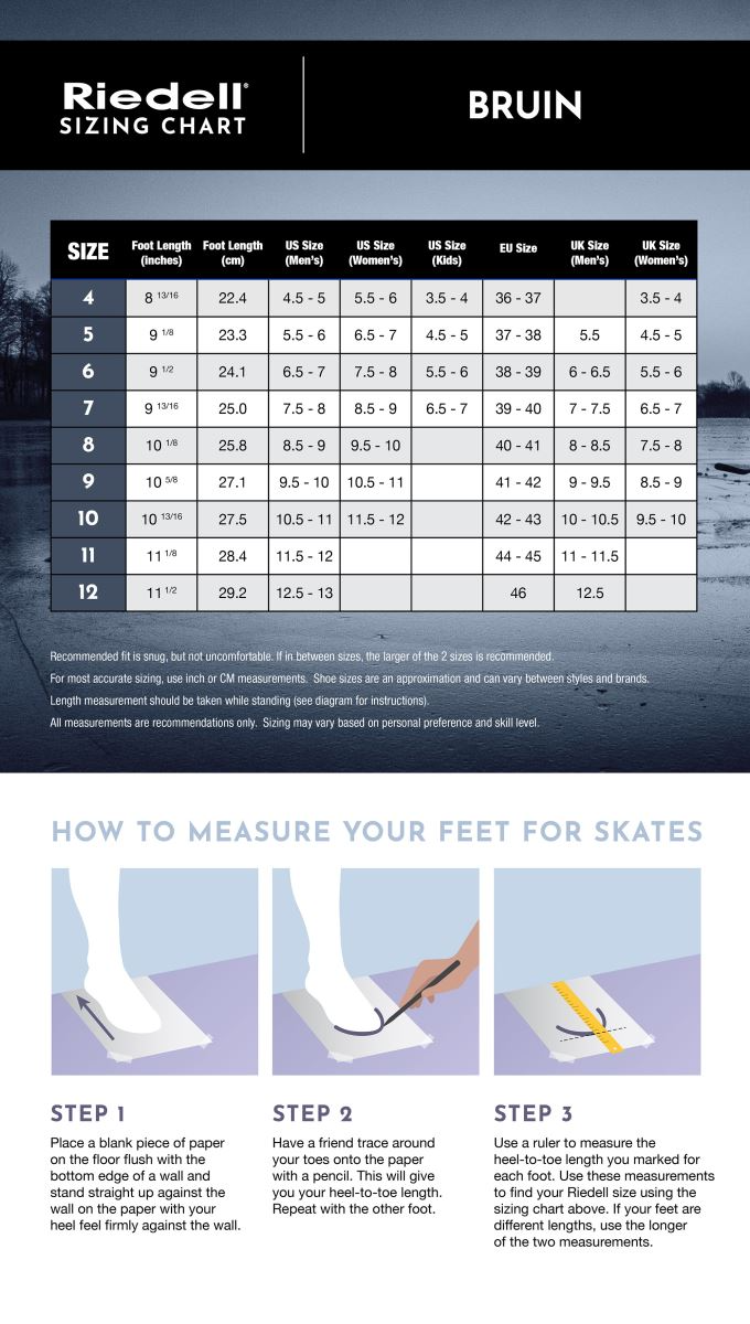 Classic design meets modern performance in the Bruin recreational hockey skate from Riedell. Durable polyester mesh uppers designed with a timeless hockey look are backed with high-density foam and brushed nylon linings that will have you feeling as good as you look, whether you’re out for a casual date skate or playing a pick-up game on the pond with your friends. To give the Bruin the lasting performance you need, the tongues incorporate a supportive EVA foam pad for protection against lace bite, and every pair is fitted with reinforced nylon outsoles, blade holders, and toe caps that have been tested to withstand high-impact events should you find yourself in the way of an oncoming slap shot. With comfort where you want it and strength where you need it, the Bruin welcomes you to get out onto the ice time and time again.