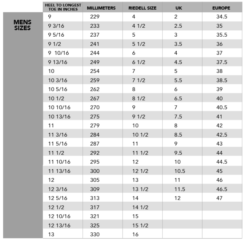 - Black: Men's 1–13, 14, 15, 16 Full and Half sizes; D Width