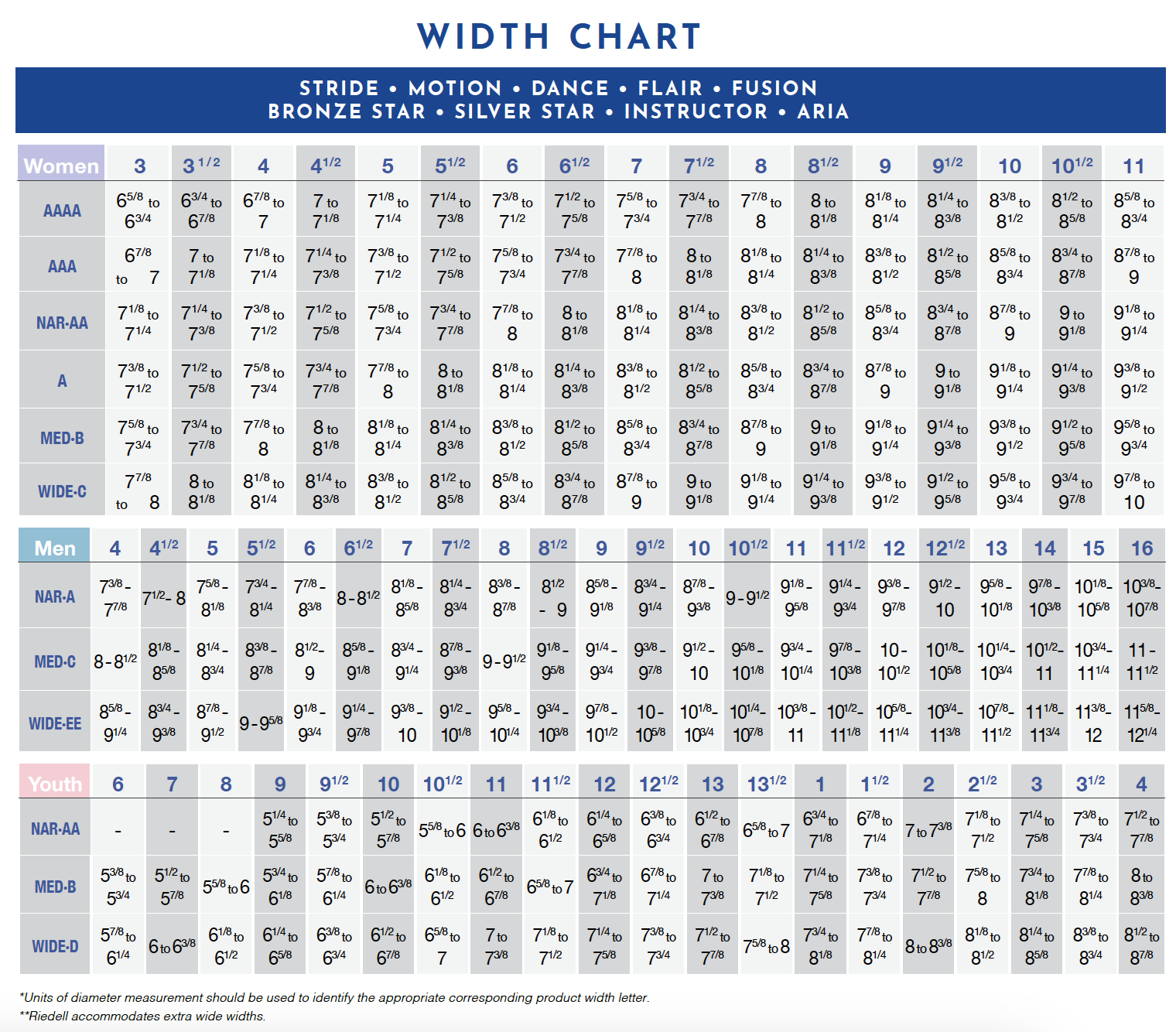 - White: 4–10 Full and Half sizes; Narrow, Medium, Wide widths